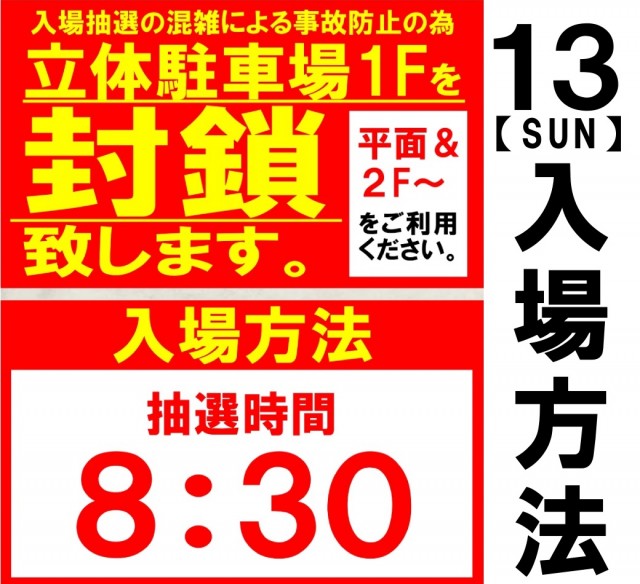 当日8:40に立体駐車場エレベーターホール前にて抽選を行います。8:50より整列開始。 |