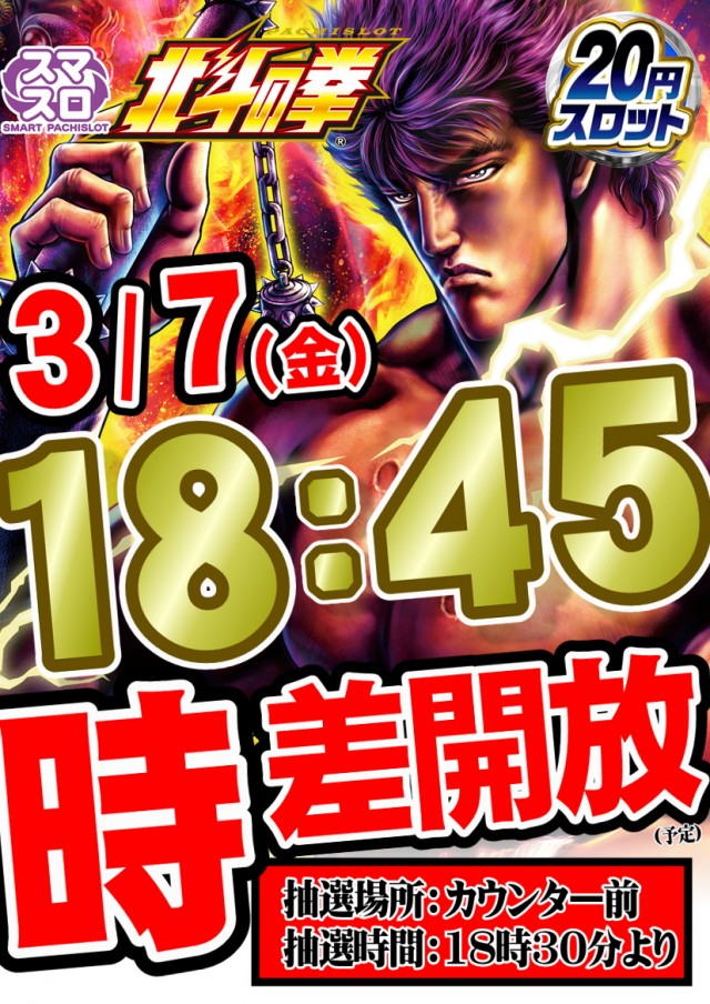 本日18:45・20円スマスロ北斗の拳時差開放(予定)