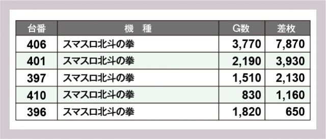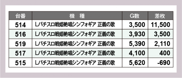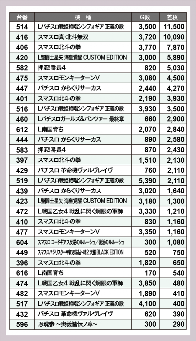 ※差枚数順に掲載しています