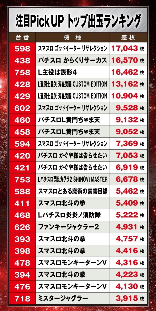 この日は人気のスマスロを中心に万枚超が5台も出現、なかでもランキングトップに輝いた『スマスロ ゴッドイーター リザレクション』は+17,043枚という圧巻の記録を残している。また、『L聖闘士星矢 海皇覚醒 CUSTOM EDITION』は2台が万枚突破に成功し店内を盛り上げていた。