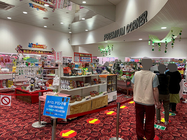 景品コーナーには日用品やお菓子など多彩なアイテムが並んでおり、プレイヤーたちの興味を引いていた。