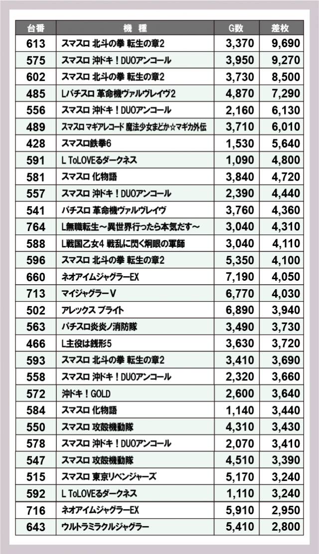 今回のランキングは『スマスロ北斗の拳 転生の章2』が+9,000枚クラスを筆頭に複数台ランクインし、機種としての圧倒的な存在感を示す結果に。さらに『スマスロ沖ドキ!DUOアンコール』も高差枚を連発し、スマスロコーナー全体の盛り上がりを牽引した。さらに『Lパチスロ 革命機ヴァルヴレイヴ2』や『スマスロ鉄拳6』なども続き、新旧問わずチャンスが広がるバランスの良い内容となった。