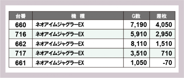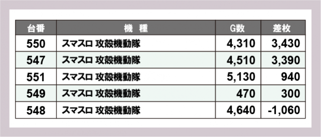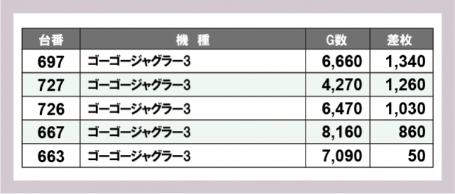機種別にみてみると、スマスロAT機が出玉面で存在感を示し、その中心となったのが『スマスロ北斗の拳 転生の章2』。複数台が上位にランクインするなど、機種単位での強さが際立った。一方で『ネオアイムジャグラーEX』や『ゴーゴージャグラー3』は高稼働から着実に差枚を伸ばしており、じっくり楽しめる環境が整っていたことがうかがえる。派手さと安定感の両方を兼ね備えた、満足度の高い内容だったと言えるだろう。