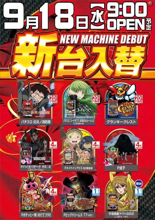 本日9/3(火)新台入替(予定)
