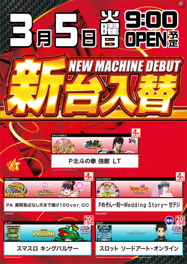 本日3/5(火)新台入替(予定)
