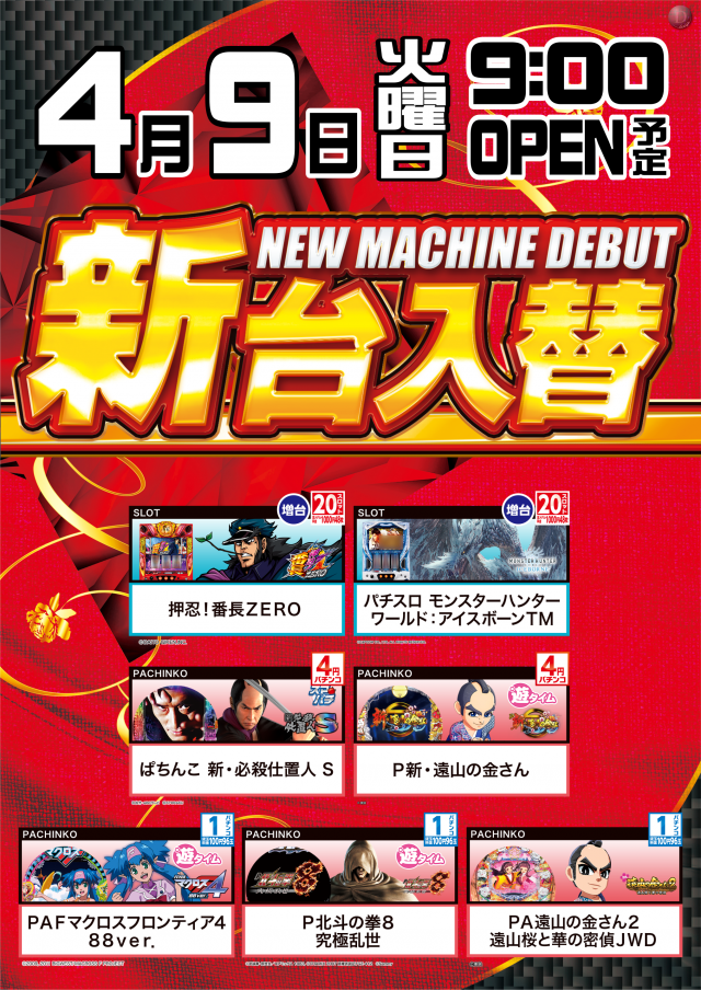 本日4/9(火)新台入替(予定)
