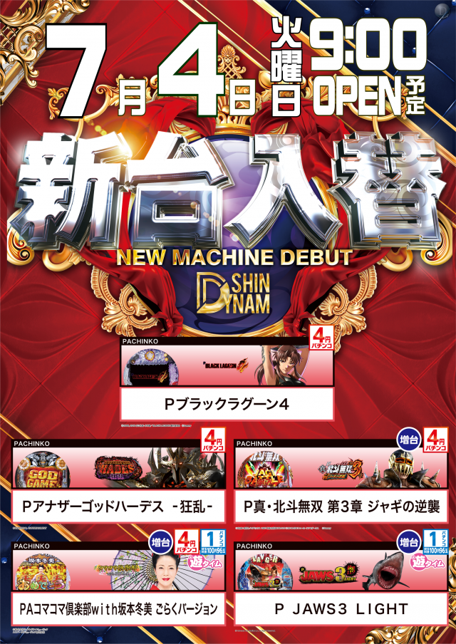 本日7/4(火)新台入替(予定)