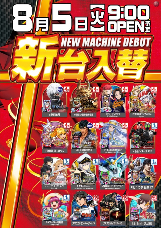 明日8/5(火)新台入替(予定)