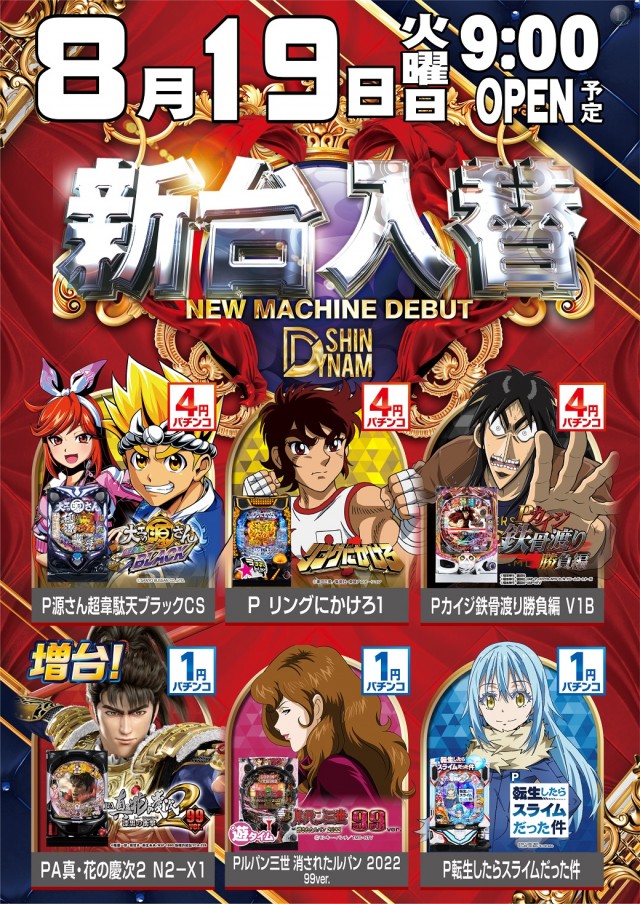本日8/19(火)新台入替(予定)
