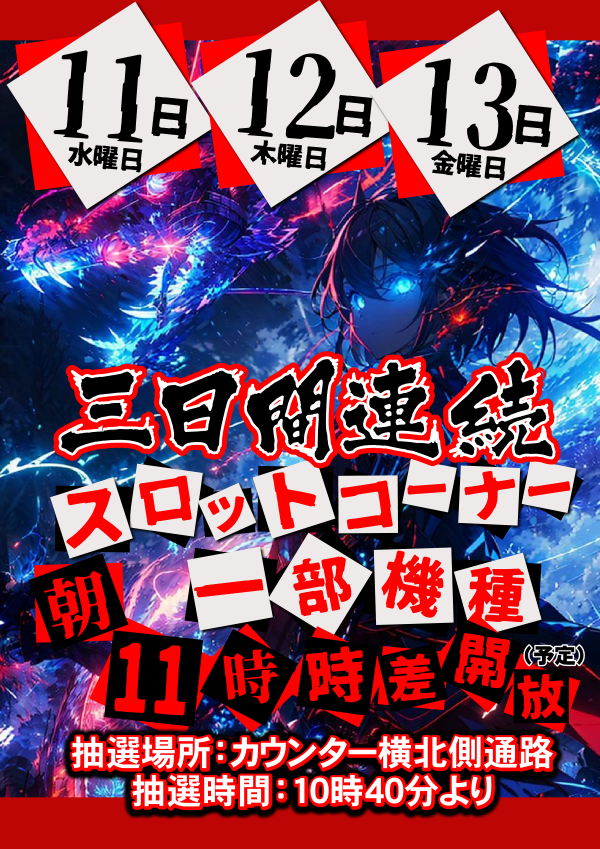 明日も!『11時』スロット一部機種時差開放(予定)