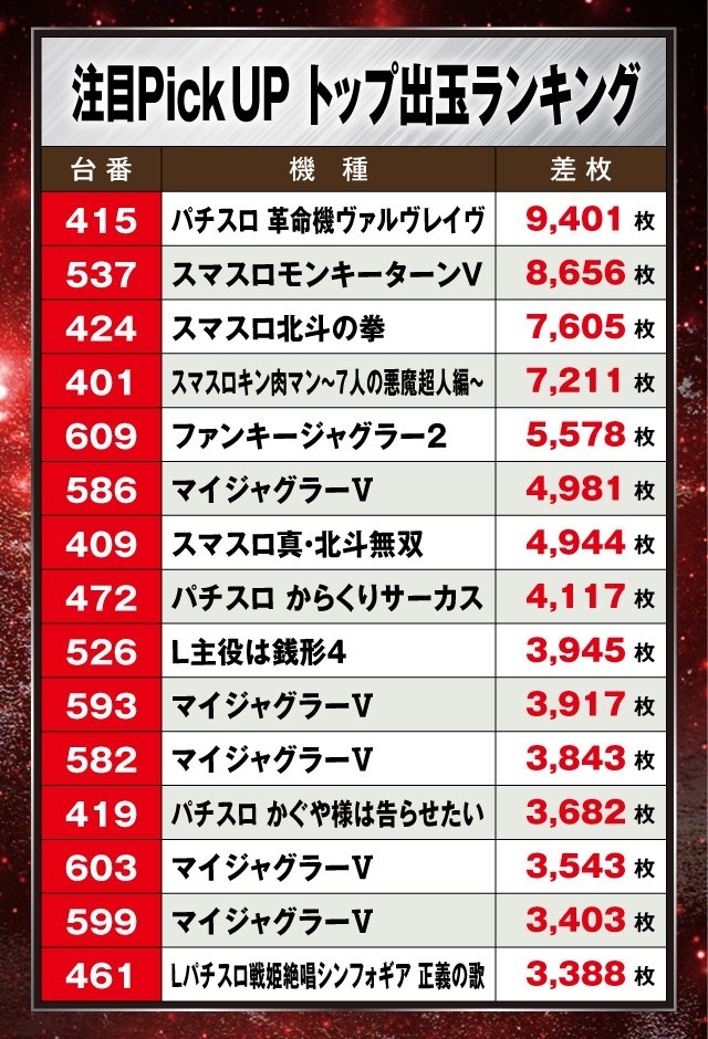 この日は初開催ならではの盛況ぶりを見せており、様々な機種で好調台を確認。そんな中、ランキングトップになったのは『パチスロ 革命機ヴァルヴレイヴ』で+9,401枚を記録、次いで『スマスロモンキーターンV』が+8,656枚、『スマスロ北斗の拳』が+7,605枚と、人気のスマスロが上位を独占した。