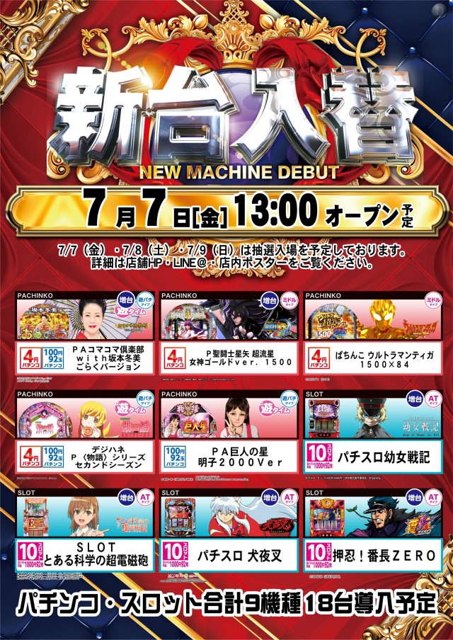 本日7日(金)新台入替!パチンコ9機種18台導入予定