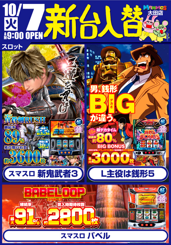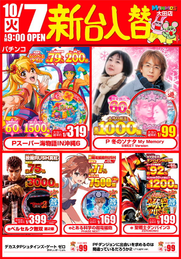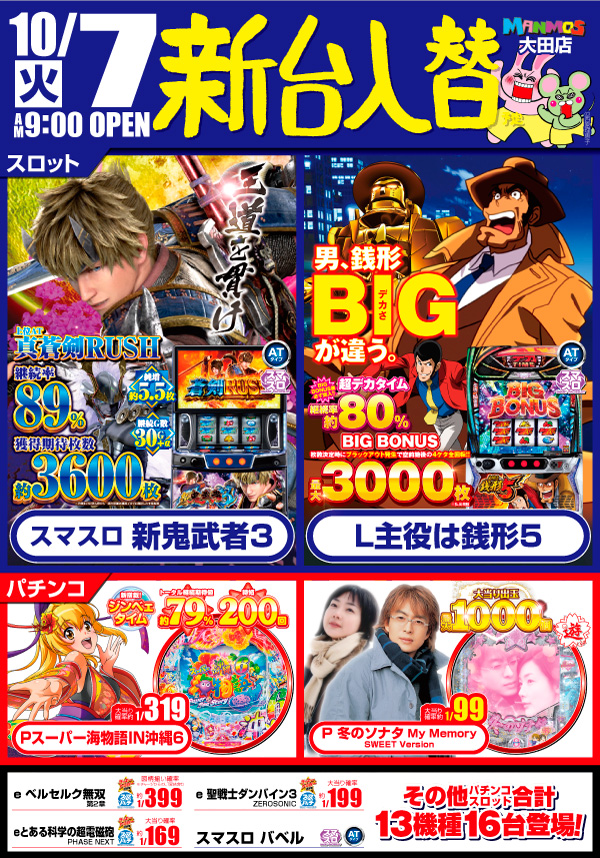 ☆☆☆☆☆☆☆☆☆☆新台オープン☆☆☆☆☆☆☆☆☆☆パチンコPスーパー海物語IN沖縄6P冬のソナタMy Memoryeベルセルク無双 第2章eとある科学の超電磁砲e聖戦士ダンバイン3etcスロットスマスロ新鬼武者3L主役は銭形5スマスロバベルネオアイムジャグラーEX8時半より抽選を開始致します明日のご来店お待ちしております