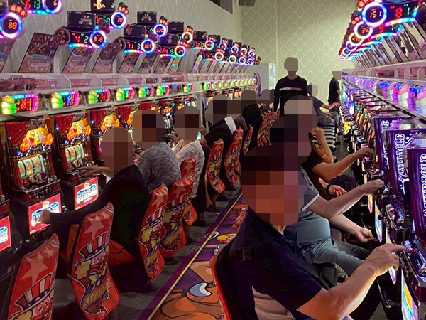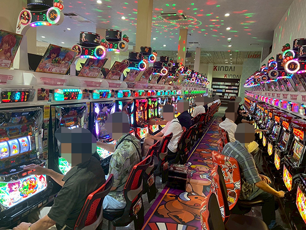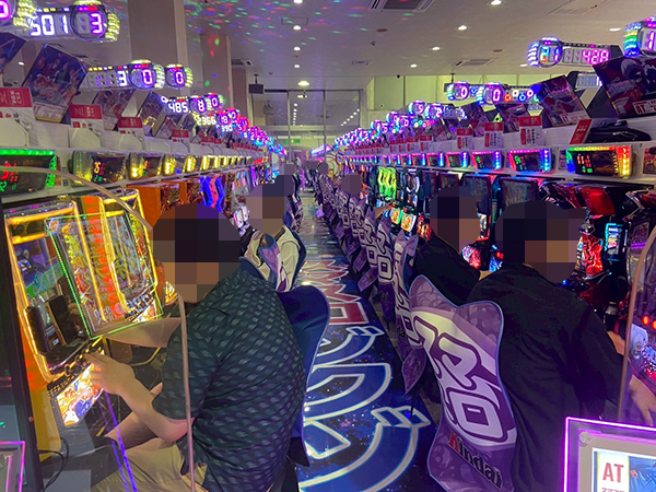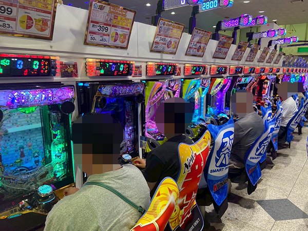 取材時は多くのプレイヤーが来店。パチンコ・パチスロともに、様々な機種が支持を得ていた。