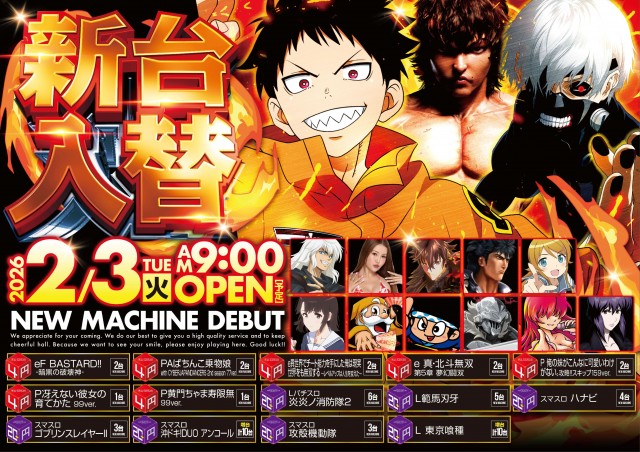 2月2日(月)【新台入替準備のため店休日を頂きます】
