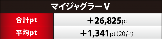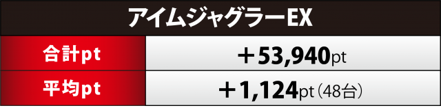 今回は『アイムジャグ』が合計ptで+5万オーバーを成し遂げトップとなり、平均ptも4桁を超すハイレベルの結果に終わった。また『ホウオウ天翔』は増台して60台設置となり合計ptで+4万超を達成。さらに『マイジャグ』20台は4機種中で最も高い平均ptをマークした。