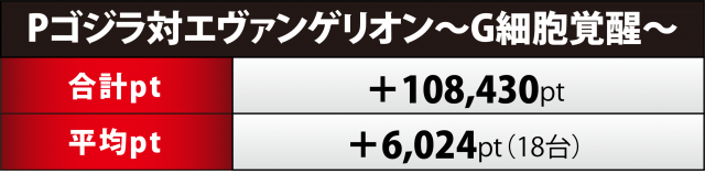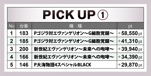 最後は上記5機種によるトップをピックアップ。合計ptでトップとなった『ゴジエヴァ』が+6万弱&+4万弱の2台でワンツーフィニッシュ、合計ptではプラスを逃した『エヴァ15』が+3万超を2台で3・4位にランクインを果たした。