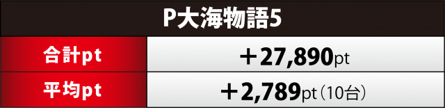 トップの『ゴジエヴァ』は合計ptで+11万弱に迫り、平均ptでは+6千超の高水準を達成。また『大海4スペシャルBLACK』『大海5』はどちらも4桁の平均ptを残した。