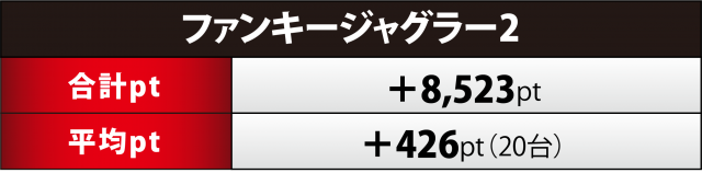 上記4マシンの中でトップかつ全機種でも合計ptの首位に立ったのが設置48台の『アイムジャグ』。+2万到達目前となったが、今までの履歴を考えると些か物足りないと言えよう。また同じく合計ptで5桁を達成したのが『マイジャグ』20台。