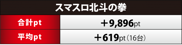 さらに『スマスロ北斗の拳』16台は合計ptが5桁到達目前に迫り、こちらも最優秀台は+7千を突破した。