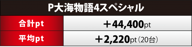 最も多い合計ptを残したのが『エヴァ15』22台は+7万超をマークしたが、平均ptで上回ったのが『大海5』10台。+5千超のハイレベルで今回のナンバーワンに輝いた。また『大海4スペシャル』も4桁の平均ptを残した。