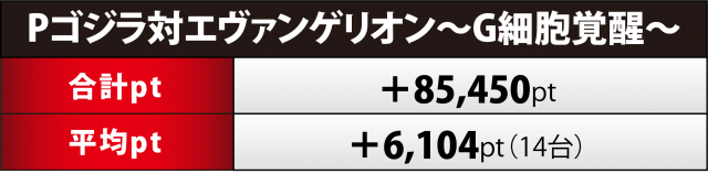 最も多い合計ptとなったのが『ゴジエヴァ』で、平均ptは+6千オーバーに達した。また26台に増台された『エヴァ15』は合計+6万超のヒット、それに次いだ『大海5』では平均pt+5千弱と『ゴジエヴァ』に迫る数値となった。