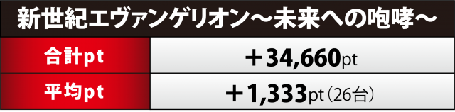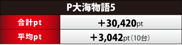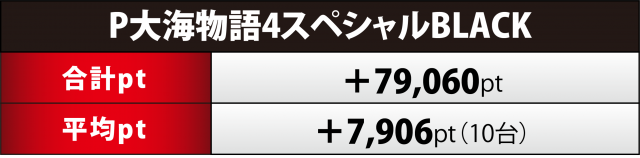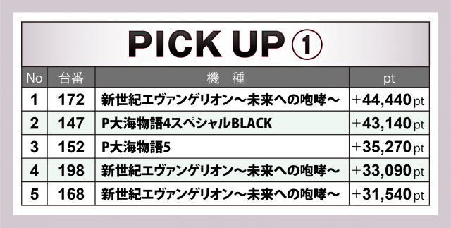 この日、強烈な出玉性能を誇るミドルスペックを飛び越え最も多い合計ptに終わったのが『大海4BLACK』10台。合計ptでは+8万弱・1台あたりの平均は+8千弱とハイクオリティを実現した。その他では『エヴァ15』『大海5』の安定感が光った。