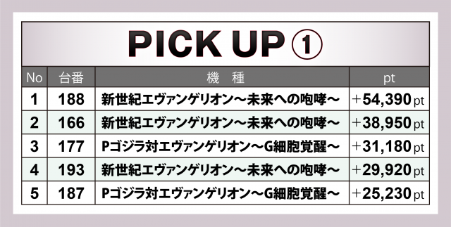 パチンコではこれまでのデータ調査の蓄積により、『P大海物語4スペシャル』『新世紀エヴァンゲリオン~未来への咆哮~』『Pゴジラ対エヴァンゲリオン~G細胞覚醒~』『P大海物語5』『P大海物語4スペシャルBLACK』の5マシンが毎回高い高稼働を収めており、好記録を叩き出す台も複数であることが判明している。