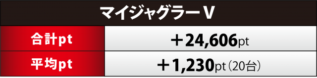 最も高い合計ptとなったのが『マイジャグ』20台。6機種では唯一+2万オーバーを果たし、平均ptでは単独となる4桁プラスを成し遂げ、その勝率は75%と安定の一言。またこの日トップとなった862番台は+4千3百超、その他では+3千超×2・+2千超×3という好出玉を見せつけた。