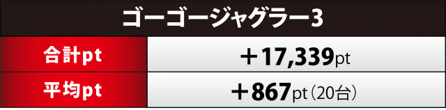 今回シリーズ機の中では唯一5桁の合計ptを達成したのが『ゴージャグ』20台。抜きん出た差枚数の台は見受けられなかったが、+2千超&+1千超が4台ずつと平均的に好調台が生じた。