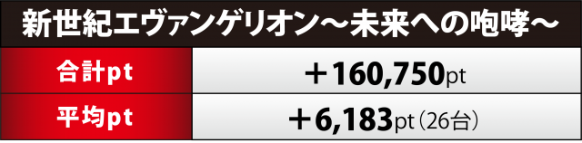 +16万オーバーと、今回最も高い合計ptを達成したのが『エヴァ15』26台。平均ptでも+6千超と高水準、後述するトップ5にも2台がランクインし、+4万3千超&+3万1千超が1台ずつとなった。