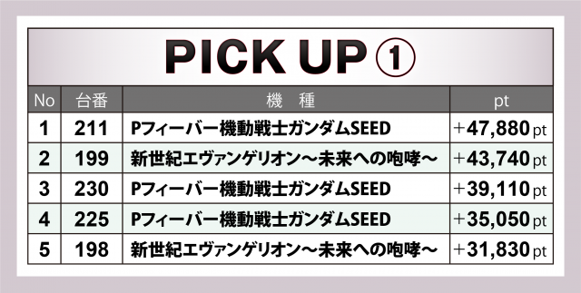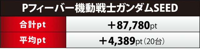 『エヴァ15』に次いで9万の合計ptを残したのが『ガンダムSEED』20台。こちらもトップ5に3台が入賞を果たし、トップの211番台が+4万8千弱の大量出玉となった。