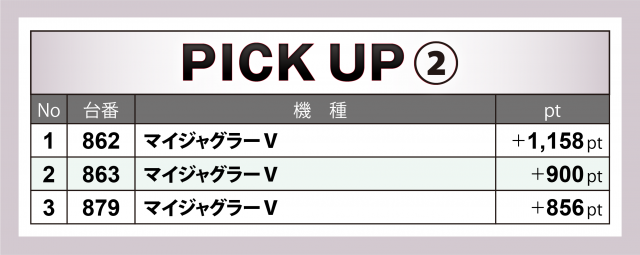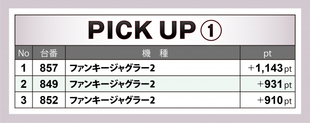 残念ながら今回の『ファンジャグ』『マイジャグ』は機種トータルでマイナスを喫し、各々のトップ3も1,000overが1台ずつと、少し寂しい結果に終わった。