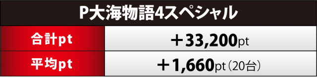 『エヴァ15』に続く合計ptを残したのが『大海4SP』20台。130番台が安定のミドルスペックらしからぬ+3万5千弱のスコアを弾き出した。