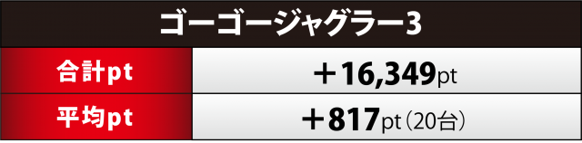 『アイムジャグ』と同じく『ファンジャグ』20台も合計ptでは辛勝。最優秀の854番台は+3千超、その他にも+2千3百弱&+1千7百超が1台ずつ輩出された。