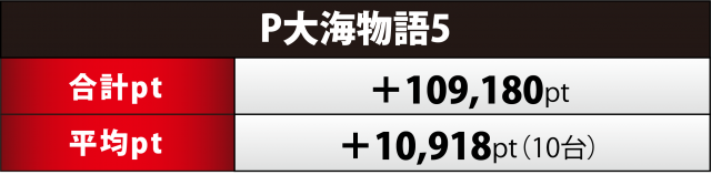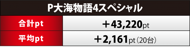 『大海5』に次ぐ合計ptを残したのが『大海4SP』20台。プラス5桁の台が3台と突出した成績の台は少なかったが、70%のプラス率でこちらもレベルの高さを見せつけた。