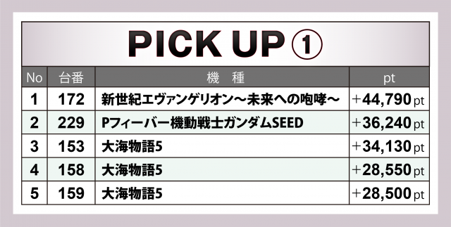 データ調査日の時点で、同店において連日に渡って稼働率・優秀台の数どちらもがハイレベルを維持しているのが『P大海物語5』『P大海物語4スペシャル』『P大海物語4スペシャルBLACK』『新世紀エヴァンゲリオン~未来への咆哮~』『Pフィーバー機動戦士ガンダムSEED』の5機種。
