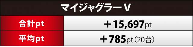 今回シリーズ4機種の中で最高の合計ptを達成したのが『マイジャグ』20台。プラス台の割合は65%(13台)、+3千超×3・+2千超×1の上、1,000overは10台と、好調台を数々生み出した。