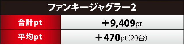 合計ptで+1万目前となったのが『ファンジャグ』20台。850番台の+3千3百超を筆頭に、こちらもプラスが12台と全体の60%を占めた。