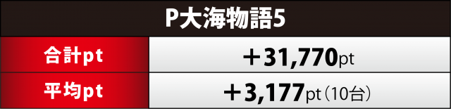 最も高い合計ptを残したのが『大海5』10台。後ほど挙げる5機種におけるトップ5で首位となる156番台が+3万7千超の差玉となり全414台の中でも最優秀となった。またプラス率は60%と、シマは好況に沸いた。