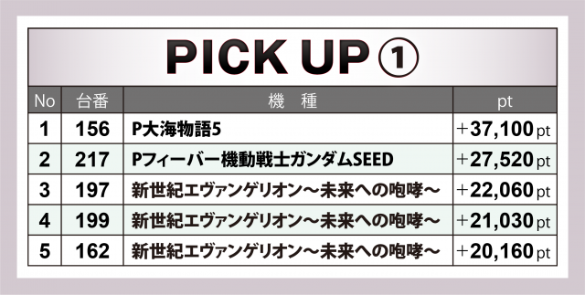 上で記した通り『大海5』が王座に就いた一方、合計ptでプラスに及ばなかった『ガンダムSEED』『エヴァ15』がランクイン。しかし、過去の記録と比較すると些か残念な数値に終わってしまった。