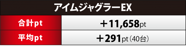 同店で2番目に多い設置台数となる『アイムジャグ』40台もプラス5桁の合計ptに成功。プラス台の割合は55%(22台)、+2千超は3台、1,000overは10台となった。