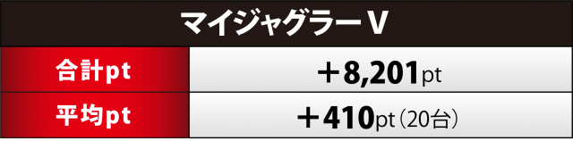 惜しくも5桁プラスの合計ptを逃したのが『マイジャグ』20台。シマナンバーワンとなったのが874番台の+4千9百超で、その他にも+2千超が2台という結果に。