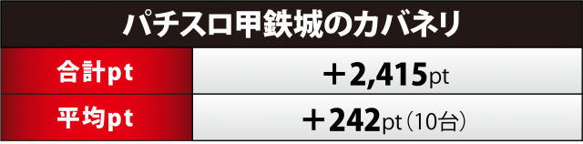 『カバネリ』10台は6機種の中では最も少ない合計ptとなったが、最優秀となった1019番台は+5千4百超となり、全414台の中でもトップクラスの差枚数となった。