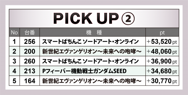 上述の通り『スマパチSAO』が1位と3位を占め、合計ptでプラスに及ばなかった『エヴァ15』は200番台が+4万8千強の出玉でランクインした。