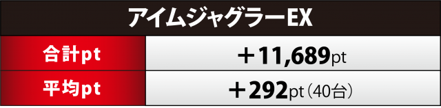 同店でも2番目に設置が多い『アイムジャグ』40台も合計ptで+1万を突破。+3千超×1&+2千超×4の他、1,000overは11台と、好調台が複数輩出された。