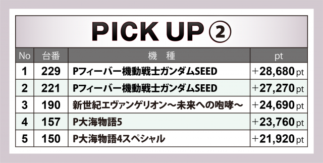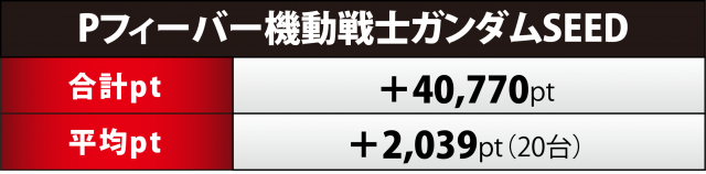 『エヴァ15』と同等の合計ptながら平均ptでは上回ったのが『ガンダムSEED』20台。こちらも下記トップ5に2台が入賞した。