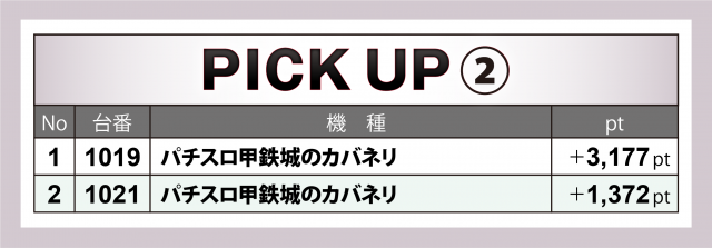 『ゴージャグ』を上回る+2万6千超の合計ptとなったのが『スマスロ北斗』20台。シマのナンバーワンとなった745番台は+8千4百超、次いで748番台が+7千5百超とビッグヒットが連発、この日の20スロ全台でもツートップとなった。他にも+3千超×2と、その好調ぶりが際立った。