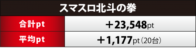 ジャグラーシリーズを上回る+2万4千弱の合計ptで今回も最も優れたスコアとなったのが『スマスロ北斗』20台。最も差枚数が高かった754番台は+7千弱と20スロ全体でもナンバーワン、続く741番台は+5千超と全台では3位に輝いた。その他1,000overは11台と全台の半数強、他にも+3千超×1&+2千超×2と、台上カウンターには輝かしい数値が連発された。