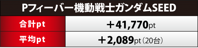 今回の5機種でトップの合計ptを残したのが『ガンダムSEED』20台。最高でも+1万9千と飛び抜けた差玉こそ見られなかったが、プラス台の割合は50%(10台)となった。